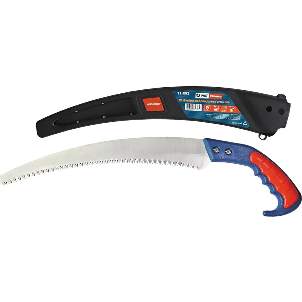 Обрізна ручна дугова ножівка загальною довжиною 490 мм призначена для роботи в саду. Комфортна вигнута рукоятка складається з 2-х компонентів і не ковзає в руках. Якісне полотно завтовшки 1 мм виготовлено з вуглецевої інструментальної сталі 65Mn та відполіроване. Довжина робочої частини 330 мм. 3D заточка зубів та 7TPI забезпечують чітке і рівне спилювання товстих гілок. Призначена для робіт з деревом твердих та м'яких порід. Пластиковий чохол призначений для безпечного зберігання та транспортування.