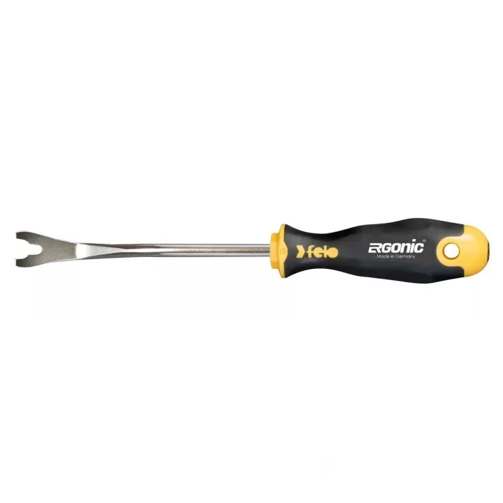 Цвяходер FELO застосовується для видирання цвяхів, для демонтажу дерев'яних коробів та ящиків. Лезо цвяхора виконано з високоякісної хром-молібден-ванадієвої сталі. Рукоятка ERGONIC - перша у світі безшовна рукоятка, яка адаптується під руку будь-якого користувача, знижує навантаження та стомлюваність, а також збільшує комфорт та максимальний момент, що крутить. Продуманий дизайн рукоятки не дозволяє інструменту скочуватися з поверхні. Зовнішнє покриття рукоятки має високу стійкість до подряпин та ПММ.