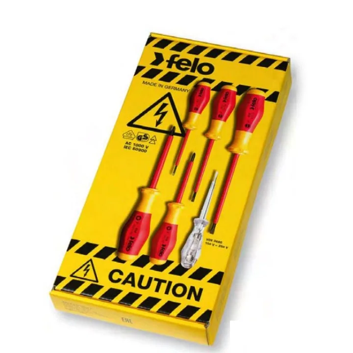 Набір викруток високовольтних 1000V шліц 2,5х0,4х75х80 мм/ 4,0х0,58х100х90 мм/ 5,5х1,0х125х100 мм/ PH1x80х90 мм/ PH2x100х100 мм/ тестер VDE 0680/6 220-250V, DIN ISO 2380/2764, спеціальна CrМоV сталь, чорний наконечник для точної посадки, двокомпонентна ер