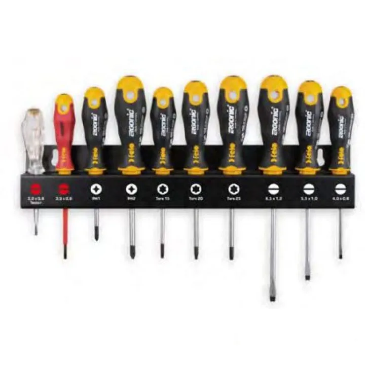 Набір викруток слюсарних ERGONІC 10 шт, шліц 4,0х100 мм/ 5,5х125 мм/ 6,5х150 мм/ PH1x80 мм/ PH2x100 мм/ TORX15х100х94 мм/ TORX20х100х101 мм/ TORX25х100х106 мм/ 3,0х70 мм викрутка-тестер / 3,5х100 мм викрутка високовольтна 1000 V, спеціальна CrМоV сталь, т