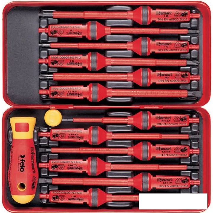 Набір викруток високовольтних E-SMART VDE 1000V шліц 2,5х0,4x75 мм/ 3,0х0,5х100 мм/ 3,5х0,6х100 мм/ 4,0х0,8х100 мм/ 5,5x1,0х100 мм/ 6,5х1,2х100 мм/ PZ2х100 мм/ PH1х80 мм/ PH2х100 мм/ TORX10x100 мм/ TORX15x100 мм/ TORX20х100 мм/ знімна ручка 95х32 мм/ прец