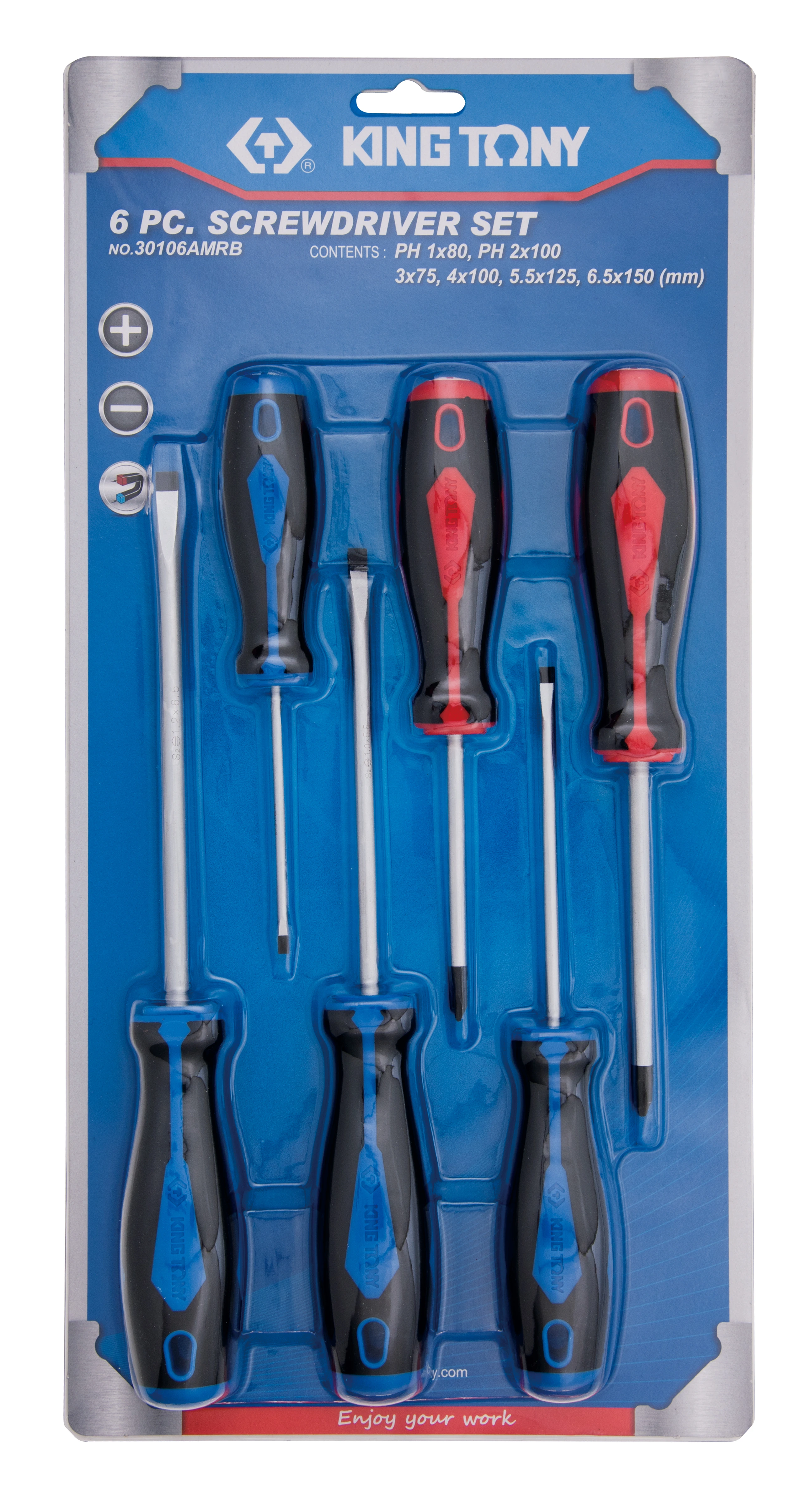 Набір викруток 14B2+14B1, 6од. Комплектація: РН 1 * 80; 2*100 3*75; 4*100; 5,5 * 125; 6,5*150 Технічні характеристики: Виробник KING TONY Вид набір інструментів Вага, кг 0,6 Країна-виробник Тайвань