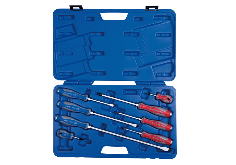 Набір силових викруток у кейсі (PH, SL) 8 предметів Набір силових викруток KING TONY 35208MR призначений для монтажу та демонтажу вузлів кріплення різних виробів, пристроїв і агрегатів. Особливості набору • Високоточна обробка намагнічених наконечників дає ідеальний контакт із кріпленням. • Силові викрутки здатні витримувати високі навантаження, стійкі до зношування та сколів. • Шестигранний профіль в основі стрижня силових викруток дозволяє докласти додаткових зусиль, використовуючи стандартний гайковий ключ. • Ергономічні двокомпонентні рукоятки PP+TPR стійкі до дії масел, бензину, кислот та лугів. • Матеріал робочої частини викруток SNCM+V – легована сталь із додаванням молібдену, покриття хром. Комплектація Силові хрестові Phillips 1461 PH1 х 75 мм PH2 х 100 мм PH3 х 150 мм Силові шліцьові Slotted 1462 SL6.5 х 100 мм SL8.0 х 175 мм SL10.0 х 300 мм Хрестова Phillips 1421 PH2 х 38 мм Шлицева Slotted 1422 SL6.5 х 38 мм