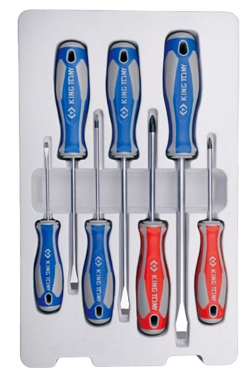 Викрутки (набір 7 ін.) Викрутка Філіпс 1421 (No.1 x 80, No.2 x 100) Викрутка шліцева 1422 (3 x 75, 4 x 100, 5.5 x 125, 6.5 x 150, 8 x 175) Набір викруток KING TONY 30117MR призначений для монтажу та демонтажу кріпильних вузлів різних виробів, пристроїв та агрегатів. Особливості набору • Високоточна обробка намагнічених наконечників дає ідеальний контакт із кріпленням. • Ергономічні двокомпонентні рукоятки PP+TPR стійкі до дії масел, бензину, кислот та лугів. • Матеріал робочої частини викруток SNCM+V – легована сталь із додаванням молібдену, покриття хром.