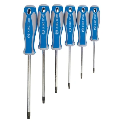 Монтаж/демонтаж кріпильних вузлів різних виробів, пристроїв та агрегатів із внутрішнім профілем Торкс (TORX, 6-променева зірка). Галузь застосування: Станції технічного обслуговування (СТО), автосервіси, автомайстерні, виробництво. Якість: У процесі виробництва робочі поверхні інструментів KING TONY піддаються спеціальної термічної обробки, що надає їм особливої міцності та стійкості до зносу або сколів. Рукоятки інструментів виконані з двокомпонентного матеріалу, стійкого до дії моторних масел, бензину, кислот, лугів та інших розчинників. Комплектація: тип інструменту / найменування серія / артикул розмір / кількість Викрутка TORX 1423 T10 x 75 мм T15 x 75 мм T20 x 100 мм T25 x 100 мм T30 x 125 мм T40 x 150 мм