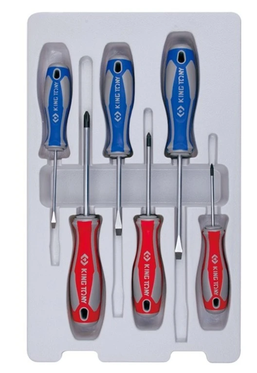 Набір викруток у коробці, 6 предметів – слюсарний інструмент для відкручування або монтажу елементів різьбових з'єднань. Набір затребуваний в автосервісі та на виробництві. У комплект входять 2 типи викруток – з хрестоподібним та прямим шліцом різних розмірів. Наконечники інструментів виготовлені із міцного сплаву та покриті оксидом заліза. Такий підхід гарантує максимальне зчеплення з елементом кріплення та стійкість до зносу. Двокомпонентна рукоятка викруток забезпечує зручність у роботі слюсарю. За еластичністю накладки не поступаються гумі. Викрутка добре лежить у руці і не передає вібрації від кріплення. Виробник: King Tony Країна виробник: Тайвань Тип інструменту: викрутки хрестові та плоскі, захист від вібрацій Матеріал: легована сталь (нікель, молібден, хром, ванадій) Оздоблення: хромування з чорним наконечником Рукоятка: PP + TPR (двокомпонентний склад) Комплектація: Хрестоподібні викрутки типорозмірів: PH0 x 60, PH1 x 80, PH2 x 100 Плоскі викрутки типорозмірів: 3 x 75, 5.5 x 100, 6.5 x 150 Вага набору: 560 грам Кількість наборів викруток в упаковці – 1, у ящику – 20 штук.