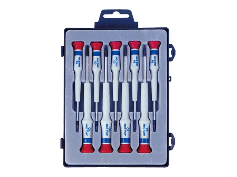 Набір викруток прецизійних 8од (Torx) KINGTONY 32309PR T4 x 40, T5 x 40, T6 x 40, T7 x 40, T8 x 40, T9 x 50, T10 x 50, T15 x 50, T20 x 50 Набір прецизійних викруток KING TONY 32309PR призначений для точних робіт із кріпленням малого розміру із внутрішнім профілем TORX (6-променева зірка). Набір стане чудовим помічником для роботи у сфері точної механіки та електроніки. Для зручності зберігання та транспортування передбачений футляр. Особливості набору • Високоточна обробка намагнічених наконечників дає ідеальний контакт із кріпленням. • Ергономічні рукоятки PP стійкі до дії масел, бензину, кислот та лугів. • Матеріал робочої частини викруток SNCM+V – легована сталь із додаванням молібдену, покриття хром.