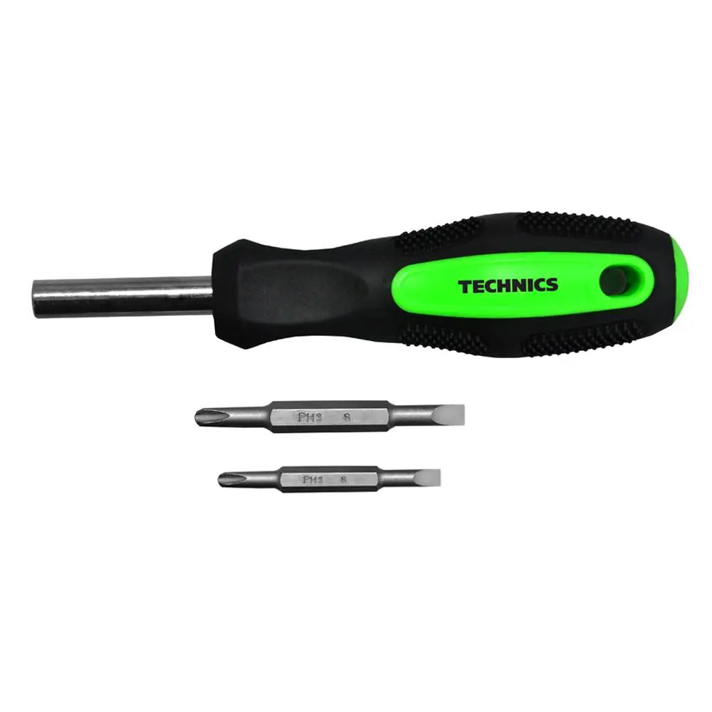 Викрутка з двома двосторонніми насадками виготовлені з міцної сталі. До комплекту входять дві змінні двосторонні насадки PH1/SL4 та PH3/SL6 довжиною 75 мм. Насадки легко переставляються та надійно фіксуються в тримачі під час роботи. Зручна ергономічна двокомпонентна (пластик + гума) ручка запобігає ковзанню інструменту та знижує навантаження на руку під час роботи, має отвір для підвішування. Застосовується при роботі з гвинтами та шурупами при монтажі та демонтажі різьбових кріплень. Завдяки класичній формі та традиційним матеріалам, зручна та надійна в роботі.