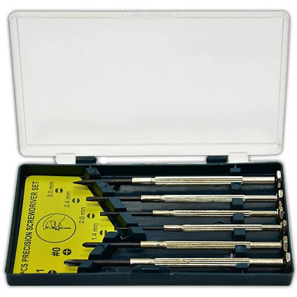 Набор специальных часовых отверток. В состав набора входят 6 шт. отверток: SL1.4, SL2, SL2.4, SL3, PH0, PH1. Стержни изготовлены из прочной стали. Металлические ручки с никелевым покрытием имеют рифленую поверхность. Защитное никелевое покрытие повышает твердость, износостойкость и коррозиестойкость. Намагниченные наконечники, облегчает работу с инструментами. Применяются при работе с маленькими винтами, для выполнения точных работ и для кропотливой работы с разной миниатюрной техникой. Используются мастерами по ремонту мобильной техники, ювелирами и временными мастерами. Удобный футляр для хранения из пластика.