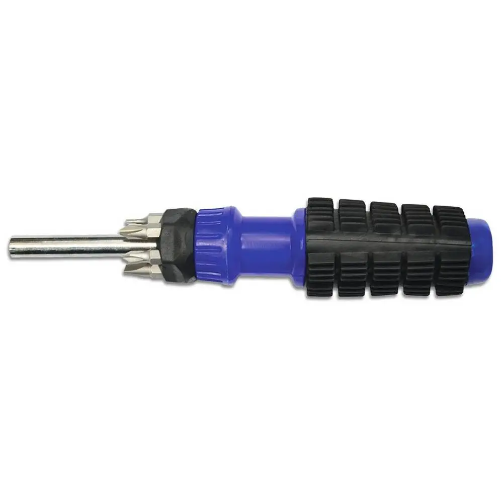 Викрутка посилена виготовлена з інструментальної сталі та має антикорозійне захисне хромове покриття. Зручна пластикова прорезинена ручка, яка не ковзає у руці при роботі. Ручка має ємність для зберігання біт, яка відкривається ззаду. До комплекту входять 6 отверточных насадок, виготовлених з міцної сталі: PH 1, 2, SL 5, 6, T 10, 15. Насадки намагнічені, що полегшує роботу ними. Застосовуються для викручування и закручування гвинтів, шурупів та інших деталей з різними типами шліца. Зручний набір для домашнього майстра, який містить необхідний набір стандартних шліців.