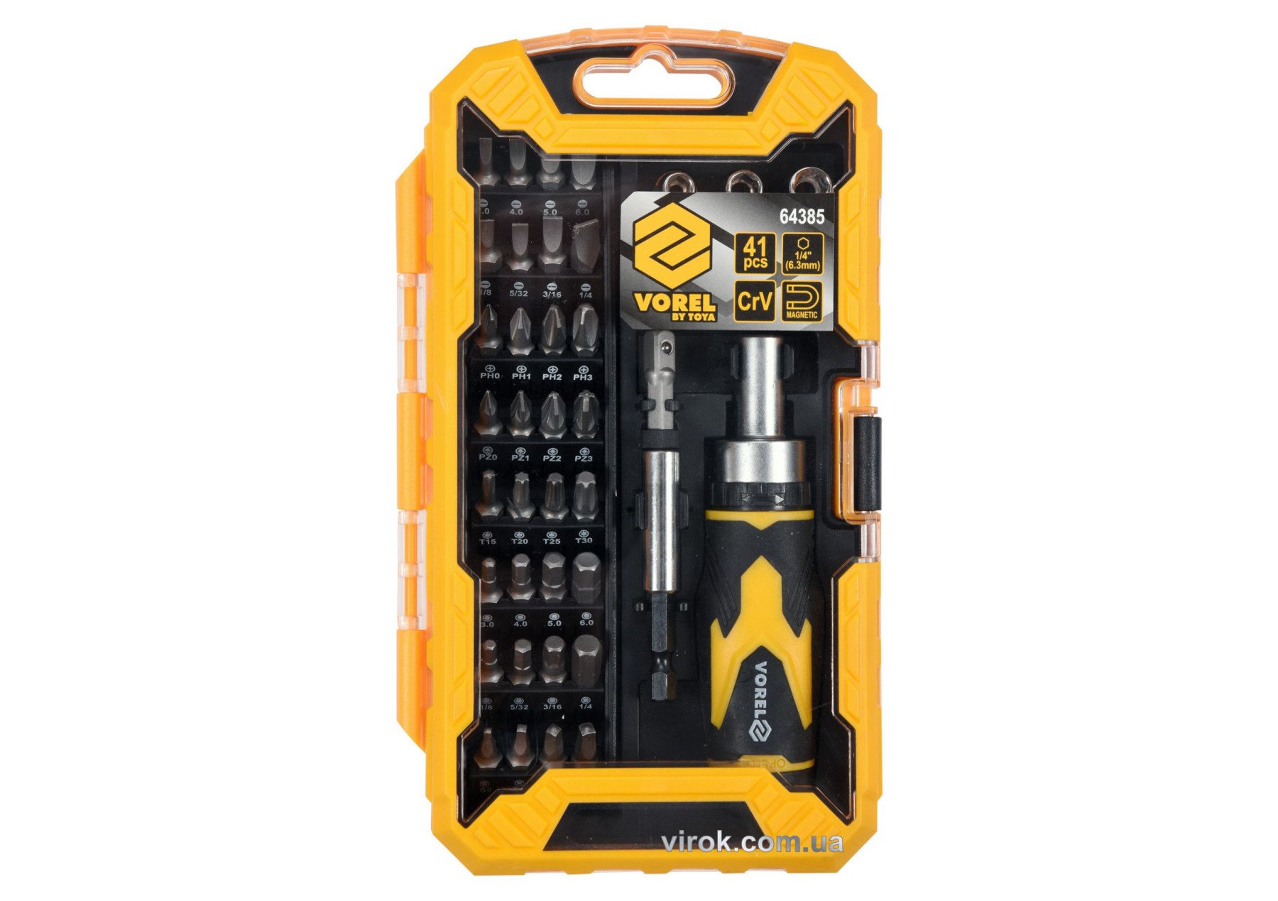 VOREL Викрутка реверсивна : Набір насадок, торцевих головок квадрат 1/4", магн. тричач 41 Елем. | 64385