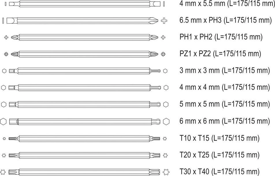 - Вм?ст набору: 4х5.5 мм, 6.5хРН3, РН1хРН2, PZ1хPZ2, 3х3 мм, 4х4 мм, 5х5 мм, 6х6 мм, Т10хТ15, Т20хТ25, Т30хТ40. L175/115 мм.