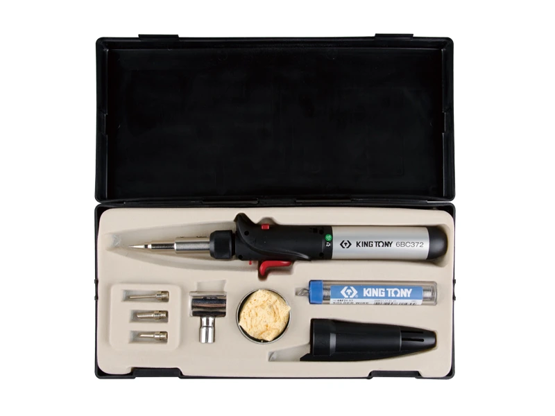 Газовий паяльник потужністю 150 Ватт із комплектом змінних насадок позиціонується як професійний інструмент для станцій ТО та підприємств. Однак, прилад знайшов застосування серед домашніх користувачів, яких зацікавив функціонал обладнання. Портативний газовий паяльник King Tony вміє видаляти лакофарбові покриття, запаювати, розплавляти, виконувати термічну усадку, випалювати та різати. Крім потужності, у пріоритеті у ручного інструменту надійність та довговічність. Виготовлений із високоміцної легованої сталі газовий паяльник бренду King Tony, супроводжується офіційною довічною гарантією. Для продовження терміну експлуатації продукту, виробник рекомендує використовувати лише оригінальні насадки та аксесуари. Комплектується газовий паяльник комфортабельним пеналом для зберігання та транспортування. Крім виробу, всередині кейсу, власник виявить захисний ковпачок з полум'ягасником для паяльника, контейнер з дротом з олова, насадки та контейнер для охолодження або чищення. Насадка для термічної усадки проводки є в комплекті. Для заправки паяльника газом розбирання інструменту не потрібне. На корпусі передбачено регулятор потужності подачі газу.