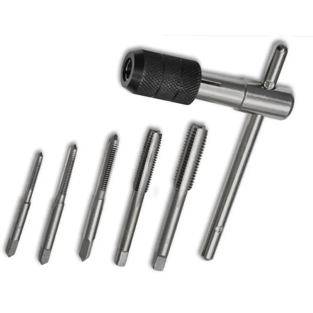 Набор метчиков предназначен для нарезки внутренней резьбы в предварительно выполненных отверстиях. Держатель Т-образный изготовлен из прочной стали, метчики из стали 9ХС. В маркировке метрических метчиков используется буквенное обозначение М, дополненное числовым показателем. Метчики данного типа измеряются миллиметрами, соответственно цифра означает размер диаметра в миллиметрах. В состав набора входит 5 метчиков размерами: М4х0,7 мм, М5х0,8 мм, М6х1,0 мм, М8х1,25 мм, М10х1,5 мм. и один быстрозажимной вороток с цанговым зажимом, который имеет рифленую поверхность и предотвращает проскальзывание при зажиме метчика.
