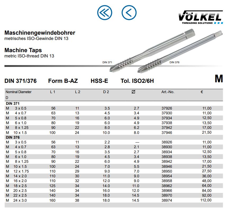Мітчик VOLKEL машинний М10х1,5, HSS-E, DIN 376, ISO2/6H, форма B-AZ, 24х100 мм (38946)