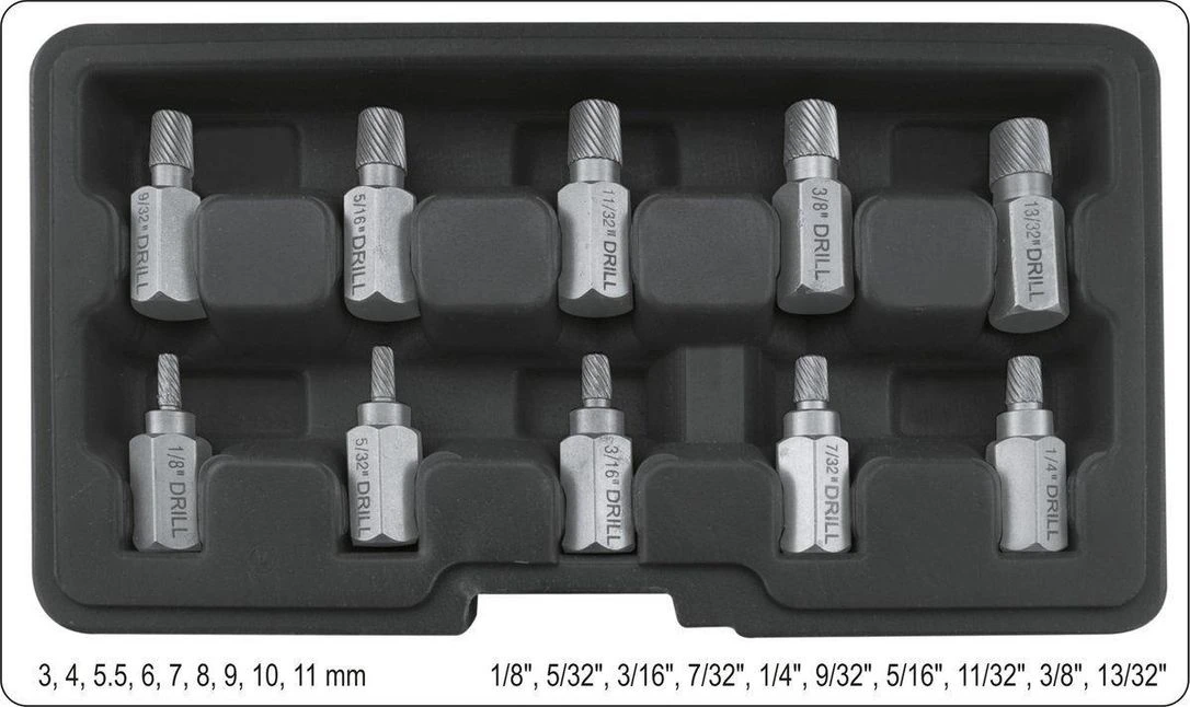Набор из 10 съемников для поврежденных внутренних шестигранных, звездообразных и шлицевых винтов YT-05890 позволяет удалить треснувшие, сломанные шурупы и дюбеля благодаря перевернутой спирали. В комплект входят размеры с рабочим диапазоном от 3 до 11 мм.