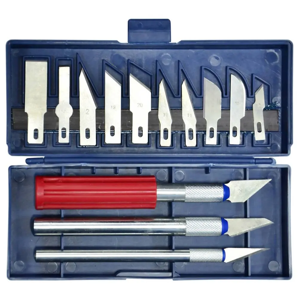 Набор ножей для резьбы по дереву суммируется с 3 ножей-держателей и 13 сменных лезвий различной формы. Ножи и лезвия находятся в удобном раскладном пластмассовом футляре. Набор предназначено для фигурной резьбы по дереву.