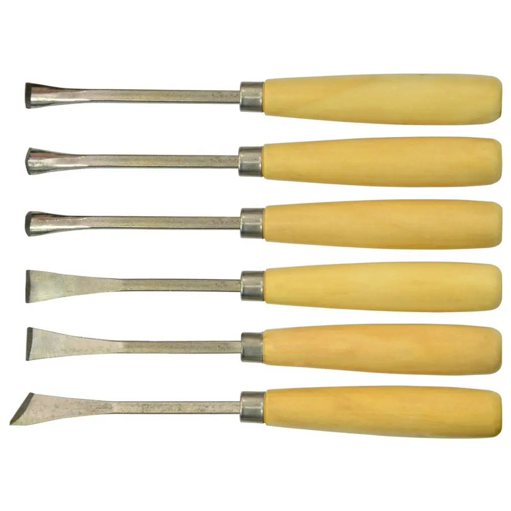 Набор фигурных стамесок для резьбы по дереву с различными формами резца. Деревянная ручка тщательно отполирована и покрыта прозрачным лаком, который защищает ее от рассыхания, появления трещин и загрязнения. Ручка имеет металлическое кольцо для надежной фиксации стержня. Предназначены для фигурной резьбы по дереву.