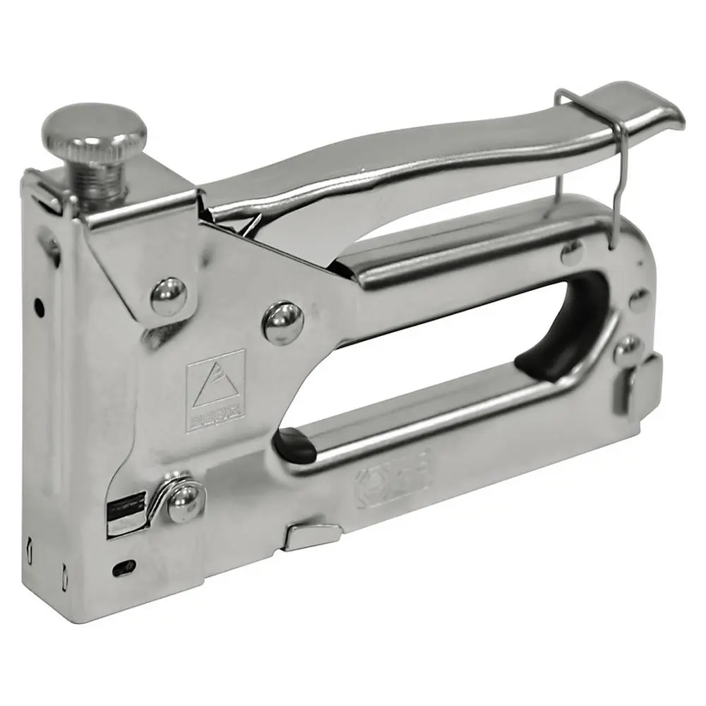 Сшиватель отделочный, корпус которого изготовлен из металла и имеет антикоррозийное защитное хромовое покрытие. Используется с прямыми скобами 11,3 мм х 4-14 мм. сшиватель оснащенный механизмом для простой зарядки скоб. Имеет винт регулировки силы удара, позволяет корректировать удар в зависимости от твердости материалов. Окошко для быстрой проверки наличия скоб. Съемная нижняя часть. Имеет фиксатор ручки в горизонтальном положении, для удобства в хранении сшивателя. Применяется для быстрого крепления материала с помощью скоб к дереву, ДСП, пластмассы и других поверхностей. Используется при выполнении садовых работ, декорировании, ремонте и реставрации мебели и при других столярных работах.