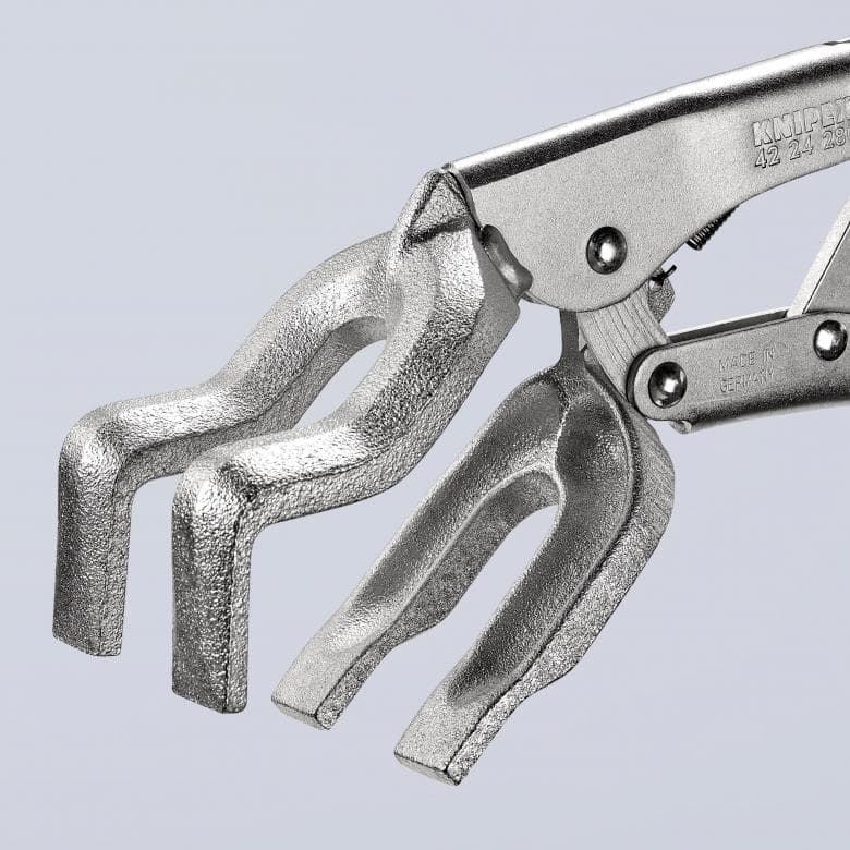 42 24 280 Кліщі затискні зварювальні для затискання та фіксації круглих, профільованих та плоских матеріалів. Для високого навантаження. З настроювальним гвинтом та важелем розблокування. для роботи однією рукою. Висока зусилля затиску завдяки важелевому механізму. - Діапазон затиску: круглі деталі: 10 - 70mm Комплект поставки: 1 x KNIPEX