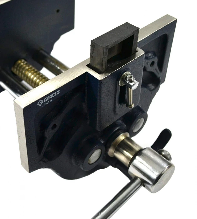 - Тиски имеют регулируемую переднюю «собачку», которая при использовании вместе с упором верстака позволяет надежно удерживать рабочие заготовки, которые не помещаются между губками. Эта удобная дополнительная функция дает возможность использовать эти тиски как стандартные и для крупных заготовок.