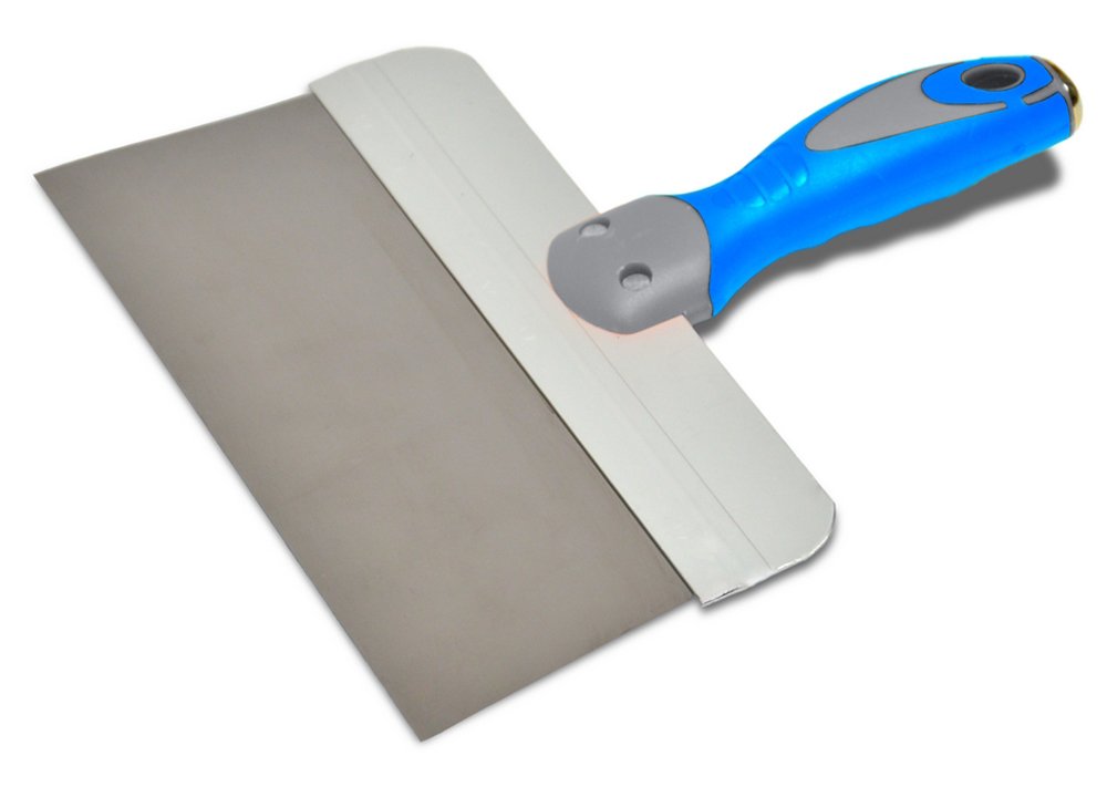 Шпатель имеет лезвие, которое изготовлеено из полированного стального полотна с нержавеющим покрытием. Шпатель имеет удобную двухкомпонентную ручку с отверстием для подвешивания. Лезвие надежно закреплено в алюминиевом профиле заклепками. Шпатель используется и служит для проведения штукатурных работ для нанесения распределения и выравнивания штукатурных и шпаклевочных смесей при отделочных работах. Шпатель имеет ширину от 150 мм до 400 мм. Шпатель используются при проведении штукатурных работ для нанесения, распределения и разравнивания строительных смесей по обрабатываемой поверхности при проведении строительных работ.