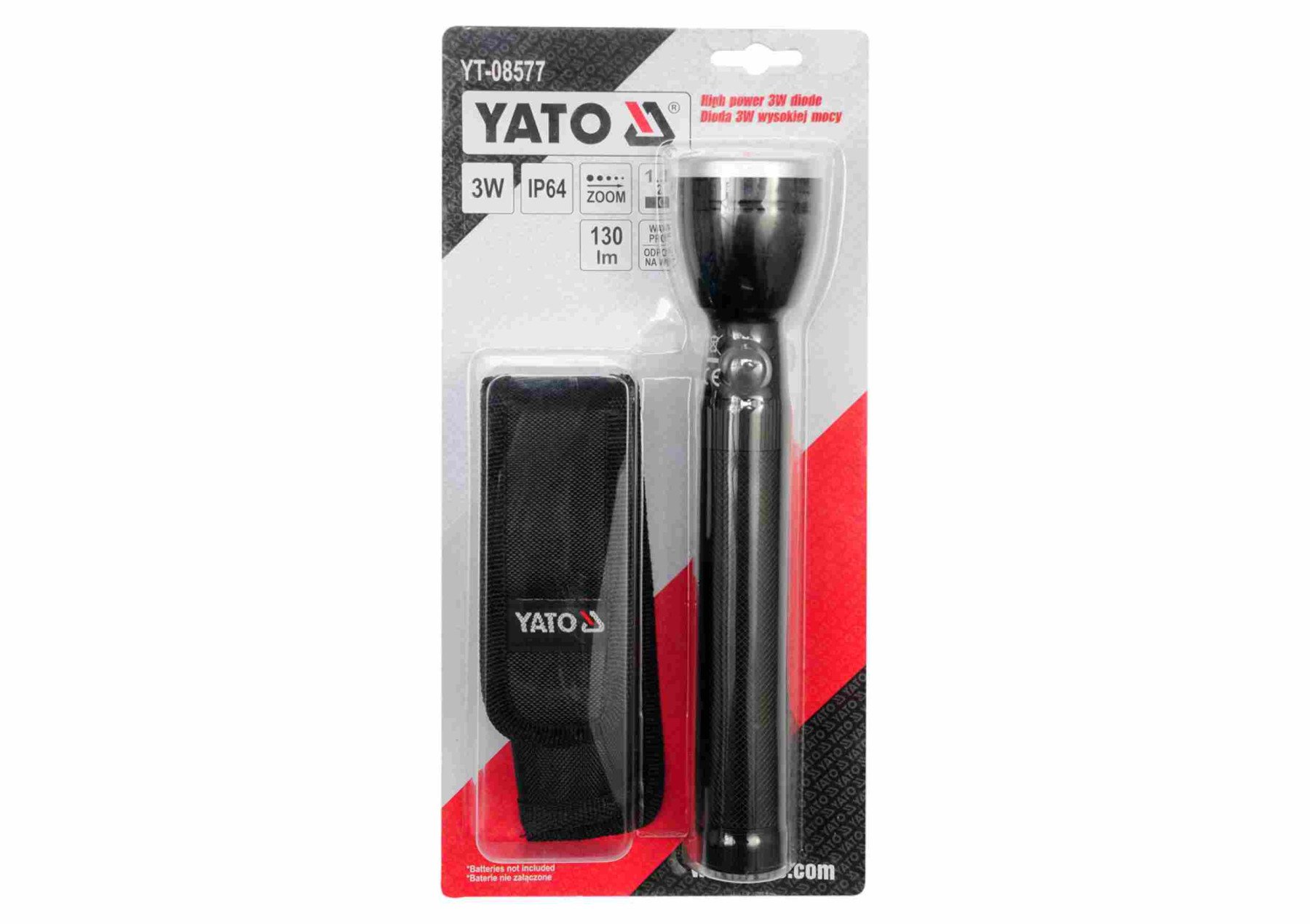 YATO Ліхтар діодний 3 Вт на батарейки 2 x R14 (2xC) і 3 режими світла; 228х 47 мм, водонепроникний, чохол