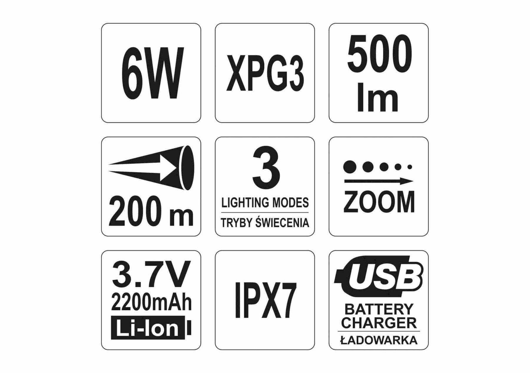 YATO Ліхтар світлодіодний (XPG3 CREE), акумулят. Li-Ion- 2.2A, Р= 6 Вт, Ф= 500 lm. Ø= 28 мм x 120 мм