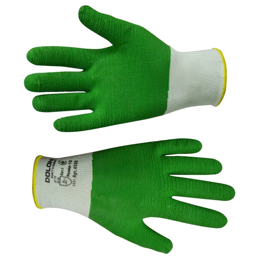 Перчатки нейлоновые выполнены в ярком зеленом цвете. Предназначены для защиты от механических воздействий, работы со скользкими поверхностями. Используются работниками СТО, АЗС, коммунальных и промышленных предприятий. Благодаря толстому текстурному латексному покрытию руки надежно защищены от воздействия химических веществ. Состав: нейлон 100%, текстурный латекс полный облив, размер 10 (L), вязаный манжет. Класс защиты 1. Характеристики в соответствии с EN 388: a) Устойчивость к истиранию (от 0 до 4) - 3, b) Устойчивость к порезам (от 0 до 5) - 2, c) Сопротивление разрыву (от 0 до 4) - 2, d) Сопротивление проколу (от 0 до 4) - 1.