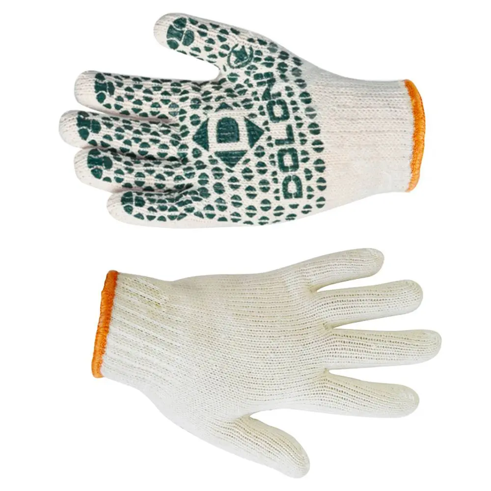 Рукавички в'язані для захисту рук при виконанні складських, монтажних, побутових та садових робіт. Рукавички робочі мають значну частку бавовни, вони дозволяють «дихати» рукам і забезпечують комфорт в роботі, вільний повітрообмін запобігає потінню рук, поліестер додає міцності, а точкове протиковзке ПВХ нанесення захищає основу від стирання, гумка на манжеті міцно фіксує рукавичку на руці, запобігаючи потраплянню будівельного і побутового сміття, оверлок запобігає розпусканню рукавички. Рекомендуються при роботах середньої тяжкості. Бавовна 70%, поліестер 30%. Клас в'язання 7. Колір білий. Розмір L. Довжина 23,5 см. Ширина 10 см. Вага 60 г.