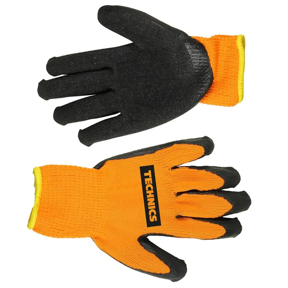 Рукавички помаранчевого кольору з поліестеру мають утеплюючий шар флісу всередині та покриття з чорного хвилястого латексу ззовні, розмір 10.