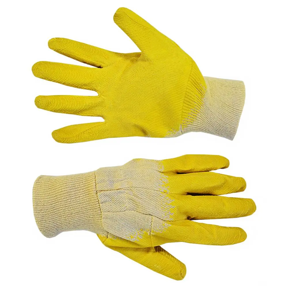Захисні бавовняні рукавички з покриттям зі спіненого латексу, облив 3/4. Рукавички в'язані кругової в'язкою, не мають швів, щільні. Бавовняна основа забезпечує високу повітропроникність, не подразнюють шкіру рук. Не пропускають вологу всередину рукавички при роботі з мокрими поверхнями. Еластичний в'язаний манжет захищає зап'ястя від подразнень і не дозволяє бруду потрапити всередину рукавички. Стійкі до проколів і порізів. Відмінний мокрий і сухий захват на слизьких поверхнях. Рекомендується використовувати для роботи з гладкими і гострими поверхнями (скло, листи заліза, арматура, пластмаса, керамічна плитка, деревина). Довжина 24 см. Ширина 12 см. Вага 100 г.