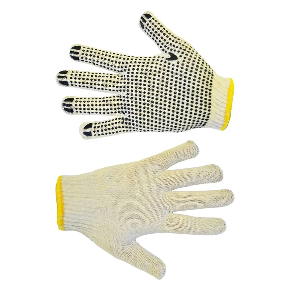 Рукавички плетені для захисту рук при виконанні складських, монтажних, побутових та садових робіт. Рукавички робочі мають значну частку бавовни, вони дозволяють «дихати» рукам і забезпечують комфорт в роботі, вільний повітрообмін запобігає потінню рук, поліестер додає міцності, а точка ПВХ захищає основу від стирання, гумка на манжеті міцно фіксує рукавичку на руці, запобігаючи потраплянню будівельного і побутового сміття, оверлок запобігає розпусканню рукавички. Рекомендуються при роботах середньої тяжкості. Бавовна 65%, поліестер 35%. 7 ниток в плетінні, клас в'язання 10. Розмір L. Довжина 23,5 см. Ширина 10 см. Вага 58-75 г.
