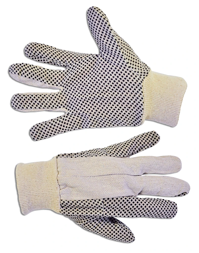 Перчатки шитые рабочие изготовлены из хлопчатобумажного полотна первого сорта. Ладонь, большой, указательный палец и мизинец полностью покрыты ПВХ точкой в шахматном порядке для защиты от истирания и лучшего сцепления с поверхностью. Эластичный манжет прочно фиксирует перчатку на руке, предотвращая попадание строительного и бытового мусора внутрь перчатки. Перчатки имеют преимущества перед вязаными перчатками, так как не растягиваются, гораздо лучше защищают руки от загрязнения, они безвредны, создают воздухообмен, не допускают потение рук. Характеризуются большей прочностью и износостойкостью за счет плотности хлопчатобумажного полотна. Могут использоваться при выполнении складских, монтажных, бытовых работ, в условиях загрязнений, в них можно работать с мокрыми предметами. Длина 26 см. Ширина 12 см. Масса 64 г. -