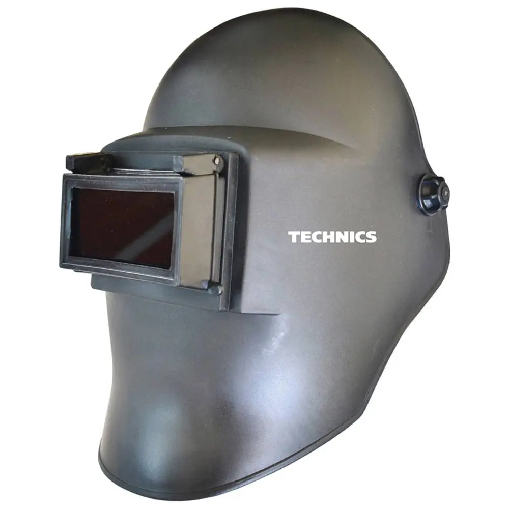 Традиційна маска зварника виготовлена ??з жаростійкого композитного матеріалу, оснащена відкидним світлофільтром розміром 52 х 102 мм, товщиною 2 мм, ступінь затемнення С-4. Тип зварювання MIG-MAG/MMA. Спеціальна форма маски дозволяє ефективно захистити обличчя і шию зварника від бризок гарячого металу. Маска з відкидним світлофільтром має захисне скло, що оберігає очі при підйомі світлофільтру. Така модель дозволяє оглянути результат зварювання, не знімаючи маску. Маска зварника використовується майстрами для захисту очей і обличчя від негативного випромінювання зварювальної дуги і від множинних бризок розплавленого металу.