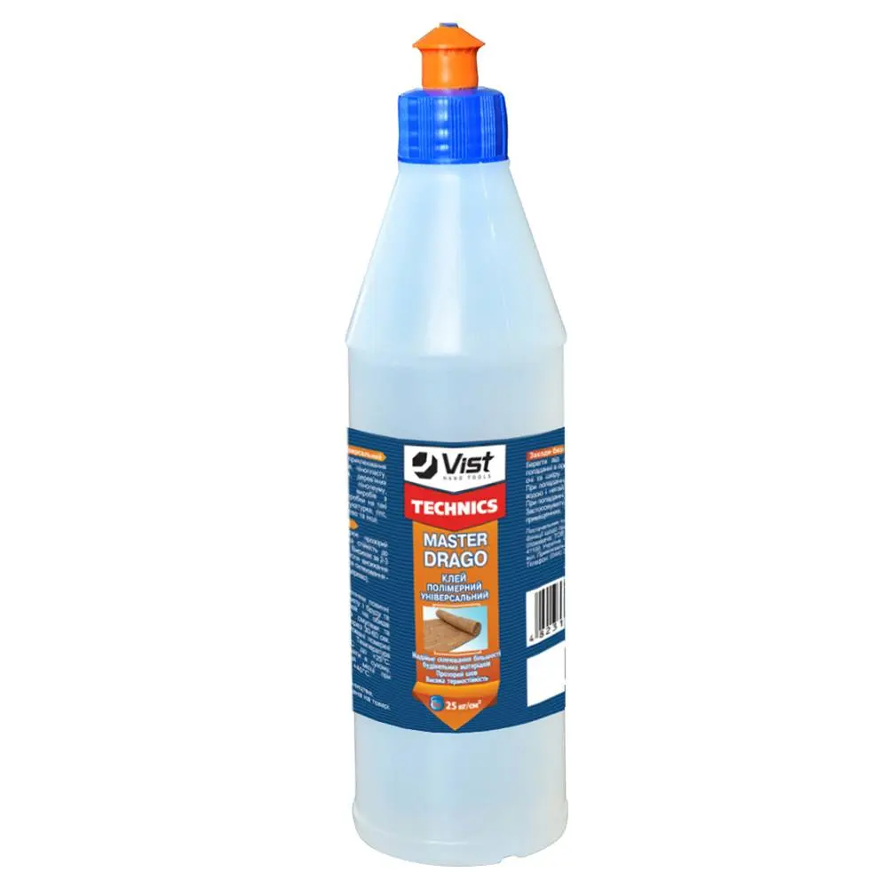 Клей полімерний універсальний 'Master Drago' призначений для приклеювання полістирольних виробів, пінопласту, утеплювачів, плінтусів, дерев’яних виробів, паркету, лінолеуму, килимових покриттів, виробів з пластмаси, кераміки, пробки на різного виду поверхні такі, як бетон, цегла, штукатурка, гіпс, гіпсокартон, дерево та інші. Після висихання утворює прозорий водостійкий шов. Має високу стійкість до механічних навантажень. Час висихання клею 30-40 хвилин. Термостійкість після висихання від -50°С до +180°С. Сила склеювання - 25 кг/см (метод дерево-дерево).