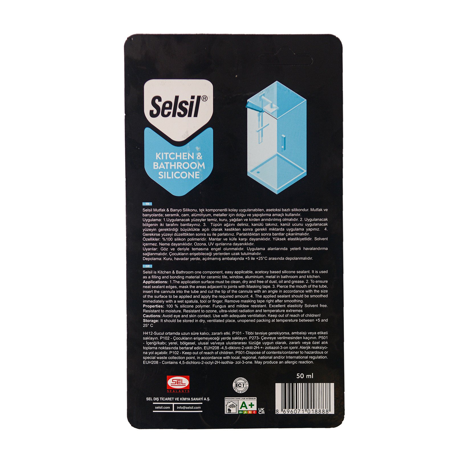 Selsil Kitchen & Bathroom Silicone — це однокомпонентний силікон на основі ацетокси, який затверджує вологою. 100% силіконовий полімер. Стійкий до грибків і плісняви. Висока еластичність. Не містить розчинників. Відповідає ISO 11600 – F&G – 25 LM. Вологостійкий. Стійкий до ультрафіолетових променів. База Силіконовий полімер Система полімеризації Оцтова Щільність 1,02 +- 0,03 г/мл (TS 781-ISO 758) Твердість 16-17 Шор А (через 28 днів) Безлипкий час 12 хв (23 oC, відн. вологість 50%) Швидкість лікування Мін. 2 мм/24 год Подовження при розриві ≥300% (ASTM D412) Втрата обсягу <,10% (ISO 10563) Пружне відновлення Яклашик 100% В’ялість 0 мм (ISO 7390) Термостійкість від 45 oC до 150 oC Температура застосування 5-40 oC