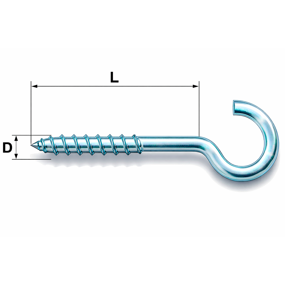 Тип виробу Шуруп-крюк С Матеріал Вуглецева сталь Покриття Оцинковане (білий/блакитний цинк) Тип різьби По дереву Форма гака С-подібна, приблизно 3/4 кола Позначення розмірів D – діаметр, L – довжина Стандарти Відповідає загальноприйнятим стандартам DIN/ISO для кріпильних виробів