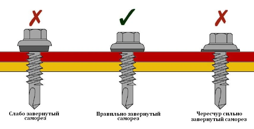 Саморезы по металлу обязательно оснащены шайбой из неопреновой резины, которая герметизирует места соединения.
