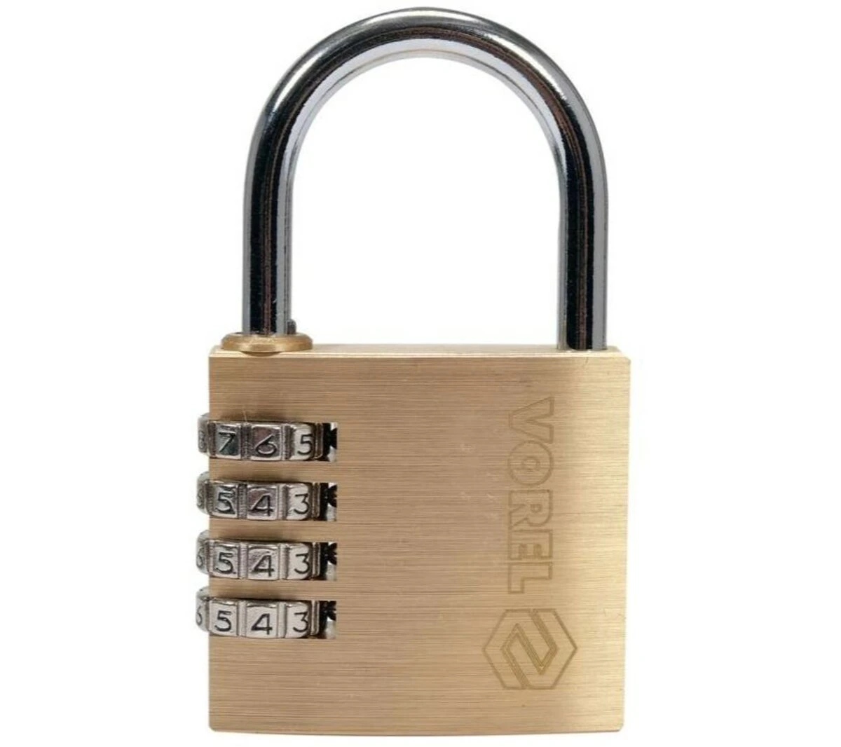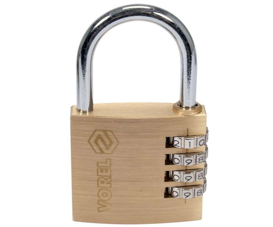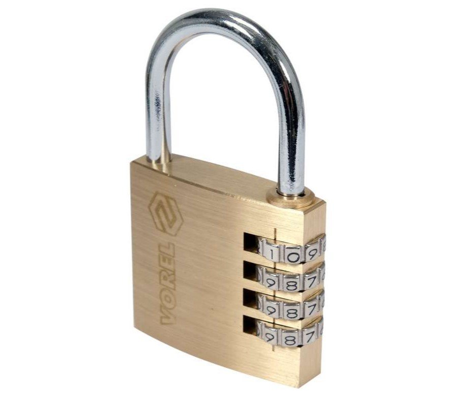 VOREL Замок навісний з кодовим замиканням : латунний корпус- 50х 13.9х46 мм, сталев дуга- 34х32х 6 мм | 77609