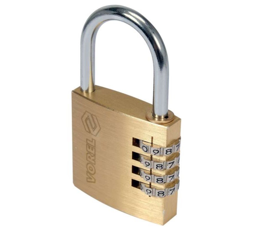 VOREL Замок навісний з кодовим замиканням : латунний корпус- 40х 11,8х39,5 мм, стал дуга- 30х25х 5 мм | 77608