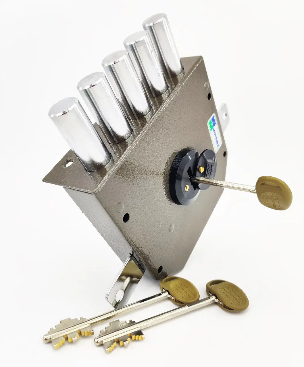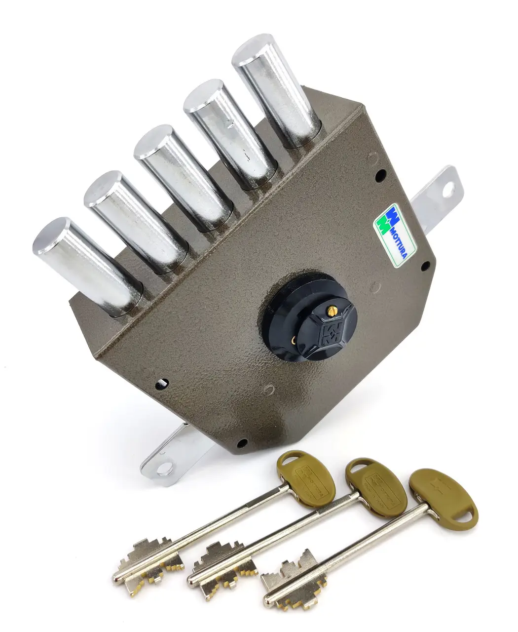 Основні атрибути Виробник Mottura Країна виробник Італія Застосування замку Металеві двері, Дерев'яні двері, Захисна конструкція, Ворота Тип встановлення замку Накладної Відкриття блоку Ліве Механізм секретності Сувальдний Кількість ригелів 4 Форма ригеля Циліндрична Діаметр ригеля 18 мм Вихід ригеля 40 мм Стан Новий Комплектація Корпус замку Так Кількість ключів 5 Відповідна планка 1 Зовнішня декоративна накладка 1 Кріпильний комплект Так Інструкція по установці/експлуатації Так -