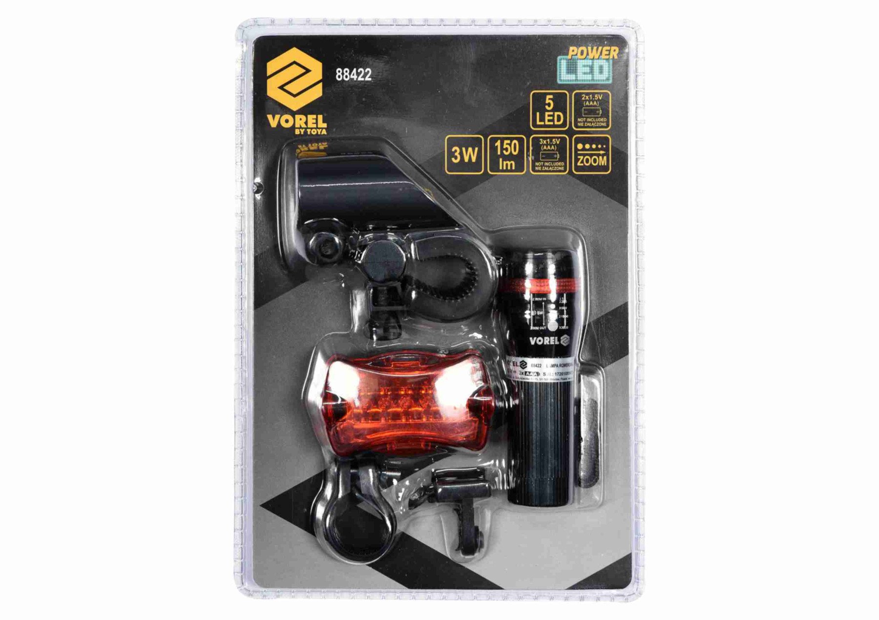 VOREL Ліхтар до велосипеду світлодіодний і задній габаритн. : 3Вт, 150lm, живл.-3ААА і 2ААА батар | 88422