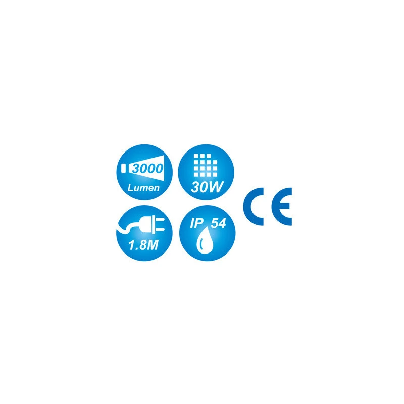 Для своєї високої яскравості (3000 Люмен) електроосвітлювальний прилад споживає всього 30 Вт. Джерелом світла служить масив світлодіодів COB, який дбайливо споживає електроенергію. Для підключення потрібна мережа 100-240 В. Кабель живлення прожектора 1,8 метра. При бажанні, можна купити інвертор та запитати освітлювальний прилад від акумулятора.