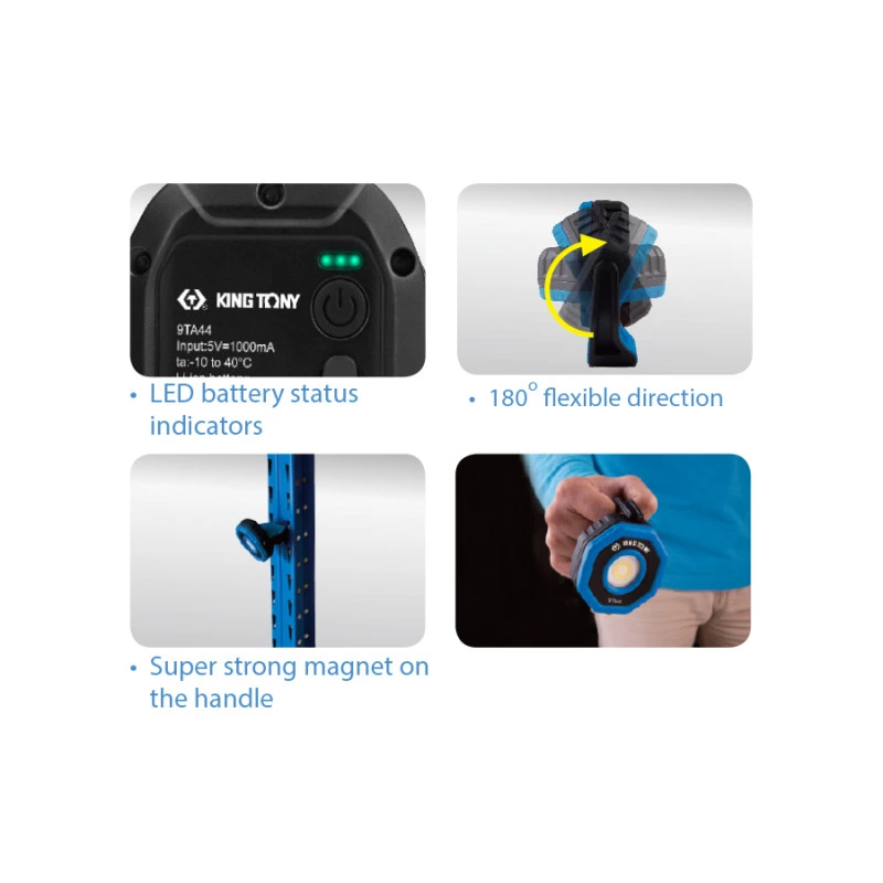 Фонарь KING TONY 9TA42A - это инспекционный фонарь, индивидуальный источник света, предназначенный для комфортного осмотра транспортных средств на станции техобслуживания или личном гараже. Очень удобный в эксплуатации, позволяет направить световой поток на необходимую область. Корпус изготовлен из качественного алюминия черного и голубого цвета, с уровнем защитой IP54, что означает защиту контактов от проникновеня пыли и грязи, а также защиту от брызг в любом направлении, таким образом его можно использовать во время дождя. Тонкий профиль с фиксируемой подставкой с возможностью регулировать наклон корпуса на 180 градусов.