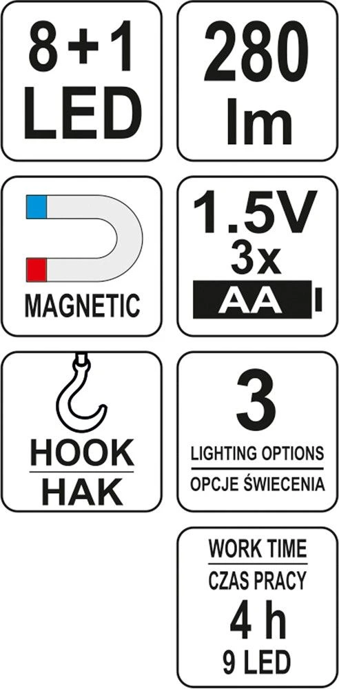 YATO Ліхтар LED на батарейки 3Х АА, 8 + 1 діод , гак + магніт , 3 режими світла