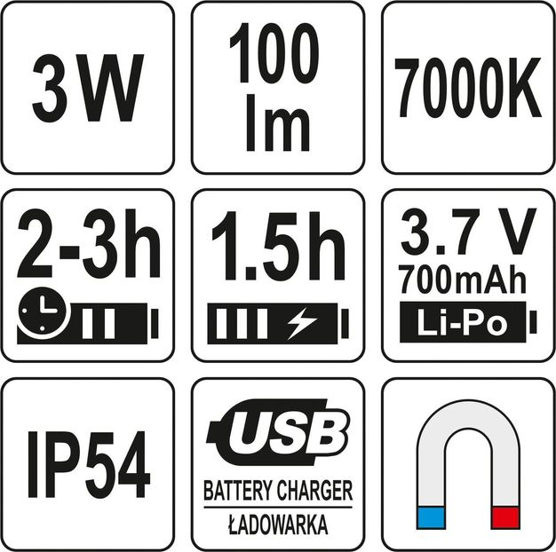 YATO Лампа світлодіодна : 3.7 В Li-Po 1.5 Агод, 3 Вт, 100 lm, гнучкий тримач з магнітом