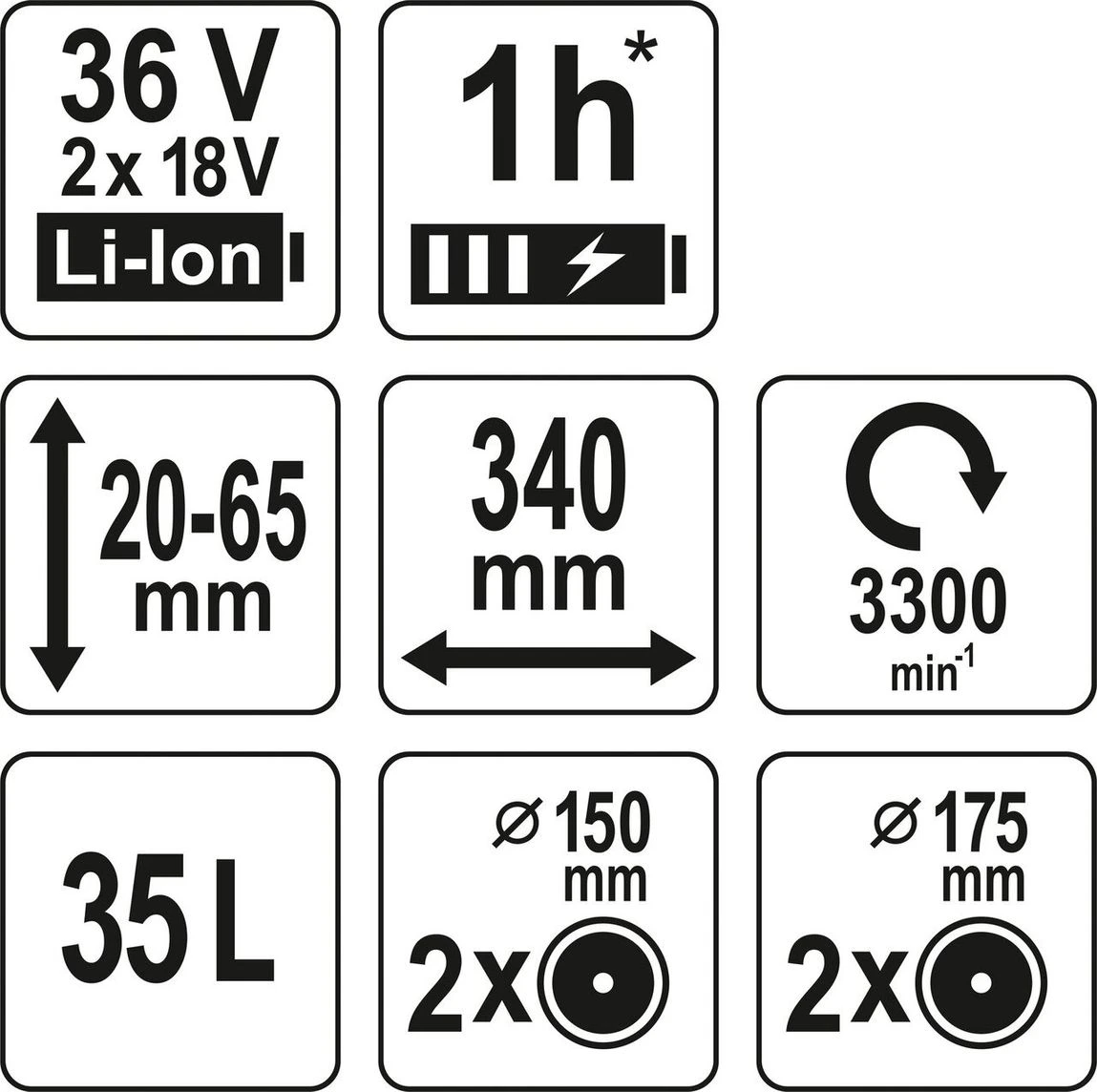 YATO Газонокосарка на 4-х колесах акумул.: 2хLi-Ion 18В,обрізн діап.Ø=34см,ємн-35л (БЕЗ АКУМУЛЯТОРА)