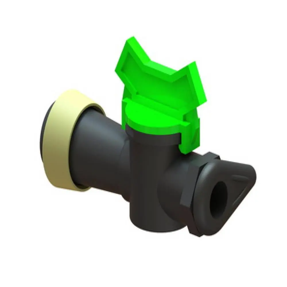Кран предназначен для соединения ленты Туман шириной 50 мм и рукава LET, который используется в качестве магистральной трубы. В магистральной трубе из шланга LFT прокалываем отверстие, вставляем флажок с резьбой, вкручиваем стартер и затем подсоединяем капельную ленту.