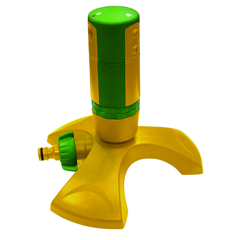 Розпилювач обертовий на пластиковій платформі, призначений для рівномірного секторно-кругового поливу клумб, газонів, присадибних ділянок, городів невеликій площі. Ножка має додаткові металеві накладки для стійкості на землі. Розпилювач має 3 режими поливу. Довжина струменя до 2,5 - 3 метрів. Рекомендований робочий тиск в системі від 2 до 4 атмосфер. Інструкція по монтажу: підключити садовий шланг через конектор до джерела водопостачання, за допомогою конектора під'єднати шланг до розпилювача, встановити розпилювач на місце поливу, відрегулювати необхідний сектор зрошення, подати воду в систему. Зберігайте в упаковці або чохлі, щоб захистити механізм та форсунки від попадання сміття.